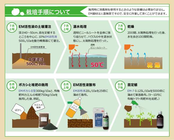 そうした時に近所のトマト農家さんから、EMについての話を聞きます。EMの製造会社であるEM研究所の提案は、太陽熱利用の土壌消毒法にEMを使うことと、ハウスの土づくりにEMボカシⅡ型とEMで発酵させたたい肥を使うというものでした。他の方法が見つからないことから、2014年7月、EM活性液の土壌灌注、EMボカシⅡ型などによる土づくりを行いました。