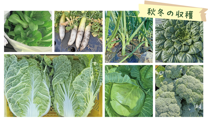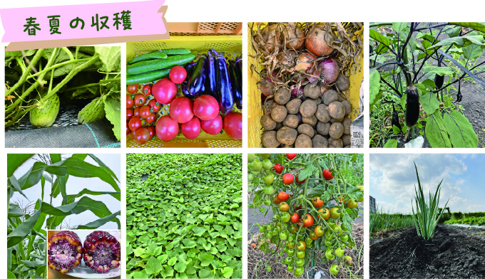 夏は、トマト、ナス、ピーマン、キュウリ、ジャガイモ、タマネギ、トウモロコシ、オクラ、サツマイモなど。冬は、青梗菜、大根、ターサイ、白菜、長ネギ、カブ、ブロッコリー、ほうれん草、小松菜、サトイモなどを中心に栽培しています。