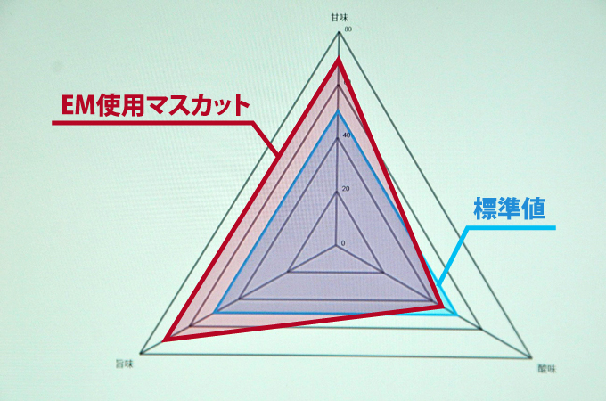 AIによる味覚解析の結果、赤で示した本園のシャインマスカットは、標準値(青)を上回る甘味と旨味を示し、酸味はやや控えめ。